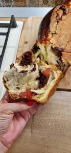 După dospire, aluatul se împarte în două părți egale. Din prima jumătate se întind două foi, care se ung cu umplutura și se rulează. Se împletesc și se așază în forma de cozonac.